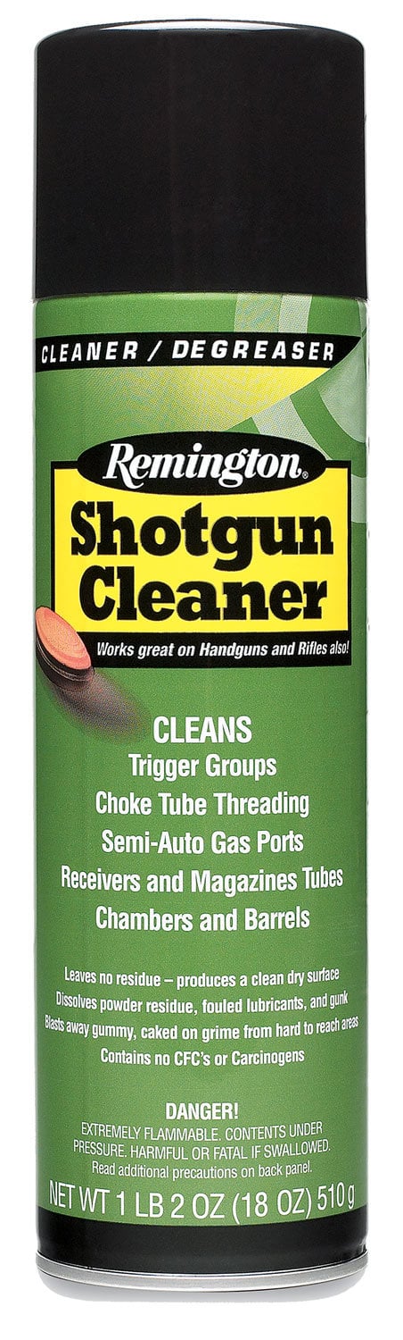 Remington Shotgun Cleaner cleans trigger groups, gas ports, choke tube threading, receivers, chambers, barrels and magazine tubes, while dissolving powder residue, fouled lubricants, burnt carbon deposits and gunk. This shotgun cleaner blasts away gummy caked-on grime from hard to reach areas such as ejectors, firing pin assemblies, trigger components and bolt recesses. Also works great on shotguns, rifles and handguns. Safe for polymers - will not damage magazines, gun stocks, camo finishes or grips.