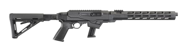 Interchangeable magazine wells for use of common Ruger and Glock magazines. Ships with Ruger magazine well installed and an additional magazine well accepting Glock magazines is included*. Ruger American Pistol magazine wells are available at ShopRuger.com. Easy takedown enables quick separation of the barrel/forend assembly from the action for ease of transportation and storage. Takedown is as simple as locking the bolt back and verifying that the rifle is unloaded, pushing a recessed lever, twisting the subassemblies and pulling them apart. Dead blow action features a custom tungsten dead blow weight that shortens bolt travel and reduces felt recoil and muzzle rise. Bolt is machined from heat treated, chrome-moly steel to ensure strength, structural integrity and durability. Reversible magazine release and reversible charging handle to support left- or right-handed use or one-handed control manipulation while maintaining a proper firing grip*. Cold hammer-forged, chrome-moly steel barrel with ultra-precise rifling provides exceptional accuracy and longevity. The heavy contour barrel provides consistent accuracy, while barrel fluting sheds unnecessary weight and allows for quick handling. Threaded barrel with included thread protector allows for use of standard muzzle accessories. Light, crisp trigger pull with minimal overtravel and positive reset utilizing proven 10/22® trigger components. CNC-machined from an aerospace-grade 7075-T6 aluminum billet, the receiver includes an integrated Picatinny-style† rail and is Type III hard-coat anodized for maximum durability. Also includes: one, SR-Series™ or Security-9® pistol magazine and hex wrenches for adjustment and charging handle removal.