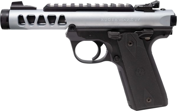 The Mark IV 22/45 Lite stands out with its distinctive Silver Gray anodized finish and Acorn Cut slide design. Its threaded barrel with a 1/2x28 thread pitch allows for easy attachment of suppressors or other muzzle devices. The pistol’s black G10 Pachmayr grips offer a secure and comfortable hold, ensuring improved handling and control during shooting sessions.