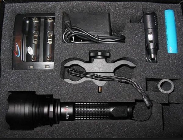 The CoyoteTLR Kit includes: Light, Home/Car Charger, (3) 2400mah batteries and universal light mount for your scope or shotgun when used with the provided spacer.