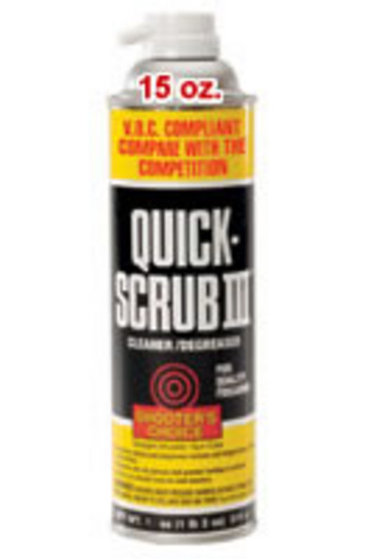 Quick Scrub III's Powerful Aerosol Fights Grime and Fouling. For Trouble-Free Actions and Precision Trigger Pulls! (Without Disassembling). V.O.C. Compliant! (Aerosol) 15 OZ. SOLVES MOST MALFUNCTIONS BY REMOVING PROBLEM FOULING: Dirt, Oil, Grease, Grime, Powder fouling, Soft carbon. QUICK SCRUB III'S ADVANTAGES: Extra Pressure with precision valving, Actions perform smoother (even in cold weather), No disassembling necessary, Evaporates quickly, Leaves no residue. RECOMMENDED USES: All conventional firearms, Fishing Tackle, Sporting Equipment
