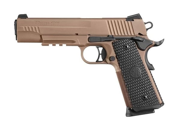 Sig Sauer 1911 Emperor Scorpion 10mm Auto 5in FDE Pistol - 8+1 Rounds - Sig Pistols are engineered to perform anywhere, at any time, and under any circumstance. They boast unique, advanced features that stand out among the rest. Sig's 1911 pistols feature exceptional ergonomics, crisp SAO trigger, all-metal frame, rugged construction and protective coating. They have been engineered for today's shooter with Sig's reliability and modern refinements. The 1911 Full Size Emperor Scorpion model is machined to exacting tolerances and fitted to insure reliability and performance. The frame and slide are machined from stainless steel with a PVD coating.