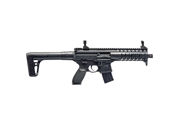 The SIG MPX redefined modern pistol caliber SBRs, and this Air Rifle version does no less for CO2 rifles. Matched to original model weight, balance and controls, the SIG MPX Air Rifle puts more accurate performance into more accessible practice. Chambered in .177 pellet, features include 8" rifled steel barrel, synthetic handguard, picatinny rail, tactical front grip, flip-up front and rear sights.
