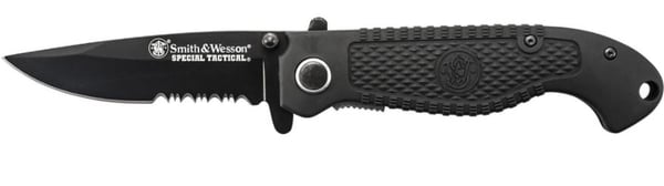 Special Tactical® Liner Lock Folding Knife is made with a partially serrated drop point blade and a composite handle. This knife has a thumb knob and index flipper. The textured composite handle has raised jimping, a lanyard hole, and a pocket clip.