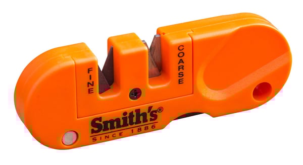 Smith's “Pocket Pal” Multi-Functional Knife Sharpener features pre-set crossed carbides and ceramic stones, which provide the “Perfect Edge” every time. Carbides provide quick edge setting, and the specially shaped ceramic stones are designed to give you a razor sharp edge on either standard or serrated edges. A fold out, tapered round, diamond coated rod is designed for sharpening serrations and small gut hooks. Unit is compact, lightweight, durable, and comes with a lanyard hole.