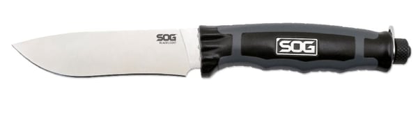 SOG sets its sights on becoming the leader in lighted blades, and this new member of the award-winning Bladelight family will find a special place among campers and outdoor enthusiasts. The six intensely bright LED lights (three on each side of the blade) have a measured output of 30 lumens, enough to help sharpen a stick for marshmallows, light up a late night cookstove or help illuminate the way to the outhouse. The fixed blade - made of 8CR13MOV stainless steel - is anchored to a glass reinforced nylon handle. One AAA battery will provide more than four hours of burn time for the LED lights. A sheath is included.