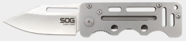Minimalist folding knife that doubles as a money clip. The SOG Cash Card has a slim stainless clip-point blade and a skeletonized handle with integrated clip to secure cash or cards. Its low-profile design makes it ideal for those who travel light.