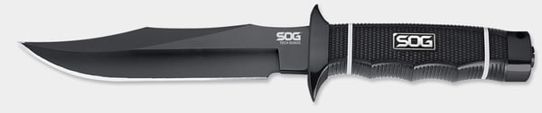 For those who are looking for the style of the SOG Bowie with a modern treatment, look no further than the Tech Bowie. The Tech Bowie has morphed into a top-notch work knife with the use of modern technology and materials. All the metal parts and including the blade, crossguard and pommel are hardcased black TiNi coated. The tactile Kraton rubble handle give a contemporary touch to the traditional leather washers. The thick (0.24") AUS-8 blade is topped off the same blade grind as the SOG Bowie. The sculpted crossguard, deep hollow grinds and precision detailing, and faceted tip are unmistakable signatures of SOG.