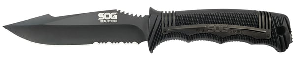 The newest member of the SEAL fixed-blade knife family, the SEAL Strike takes everything SOG has learned from years of real-world deployment and combines it into one spectacular package. This quality AUS-8 stainless steel, partially serrated blade is an excellent field companion for outdoor and underwater adventures. The SEAL Strike is serious business and carries on the tradition of supplying the world's elite military forces. It comes with a standard hard nylon sheath or a deluxe model with built-in cord cutter, single-stage sharpener, firestarter, and larger attachment points. Be at the ready with the fully capable SEAL Strike.