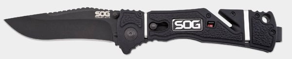 The Trident Elite features SOG’s patented Assisted Technology for quick one-handed opening. The slot cutter built into the handle can cut thin rope, belts, or webbing without opening the blade. The front of the handle has a built-in glass breaker for any situation. The Trident Elite comes with a 3.7-inch blade made of reliable AUS-8 stainless steel and a durable glass-reinforced nylon handle with textured rubber inserts to improve grip.