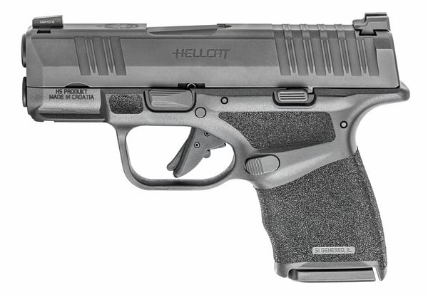 Rear serrations run over the top of the slide for quick and easy manipulation and are designed for positive engagement. The Hellcat's flat trigger body and nickel boron-coated trigger group provide a consistent trigger pull. A full length guide rod and dual active recoil spring ensure reliable operation and a smooth recoil impulse. The Hellcat also features a textured stand-off device at the muzzle that ensures the pistol will fire when pressed against a target.