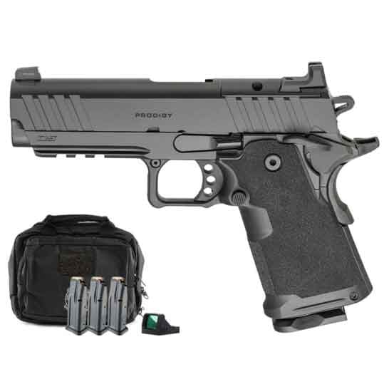 The Prodigy is Springfield Armory's 9mm double-stack offering based on the proven 1911 platform. Built around a double stack magazine, the compact polymer grip module mounts to a forged steel frame and offers a capacity of 15-rounds.