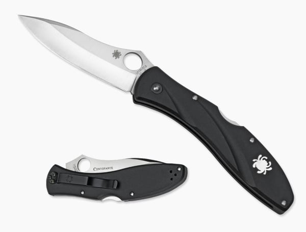 The Centofante 3 has a thin-profiled, lightweight FRN handle. Two channels are furrowed out of the handle for better grip and a Palladium silver Spyderco bug is inlayed into its surface. For added security and convenience the back-lock is positioned midway on the spine and David Boye Dent is cut from the locking lever. The VG-10 blade has both a hollow-grind and swedge-grind with non-sharpened spine serrations (jimping) to hold the thumb steady when cutting. A black steel pocket clip positions for tip-up/down, right-hand carry.
