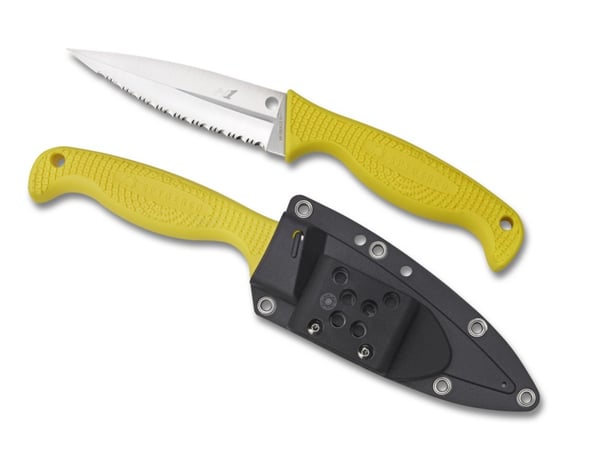 Since the introduction of our remarkable Salt Series™ of rustproof knives, Spyderco has received numerous requests for a fixed-blade knife specifically designed to meet the demanding needs of free divers and spear fisherman. These daring sportsmen do not use SCUBA gear and dive deeply relying only on their ability to hold their breath for extended periods. If they become tangled in a fishing line, net, or other obstacle or have the need to dispatch a speared fish quickly, they need a dive knife that cuts very aggressively and has a sharp, very acute point. The Fish Hunter was designed to meet that challenge.