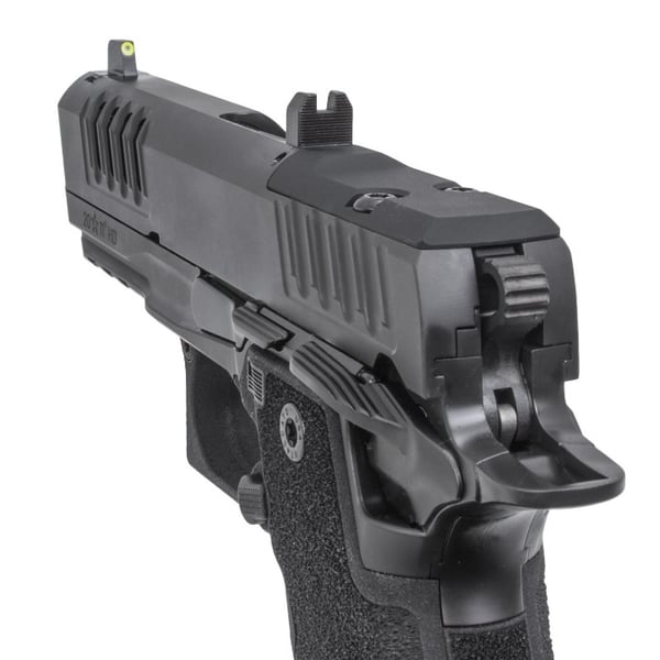Narrower grip with no grip safety, higher beavertail, more aggressive "wrap-over" slide serrations, and support-thumb index points create a more comfortable, consistent shooting experience even under adverse conditions.