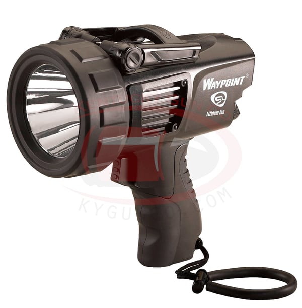 The Waypoint Rechargeable pistol-grip spotlight by Streamlight features C4 LED technology and a rechargeable lithium ion battery that fully recharges in 4 hours. The trigger-style switch provides easy momentary and constant-on operation, and the secondary rotary switch selects high (370 lumens), low (30 lumens), and emergency signal functions. The Waypoint Rechargeable features high-impact polycarbonate housing, a rubberized lens protector, and an integrated stand for scene lighting. It is waterproof to 2 meters and includes a high-strength adjustable lanyard and a 5-ft 120V AC charging cord.