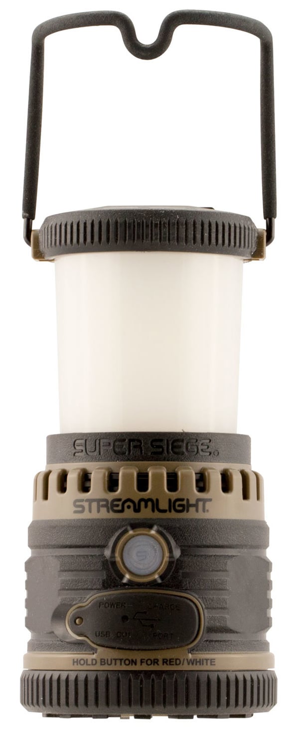 Streamlight's Super Siege is a rechargeable 1,100 lumen scene lantern that provides an auxiliary USB power source to charge mobile devices, or other Streamlight products. Its 8800mAH lithium ion battery capacity gives up to four full charges for most smart phones.