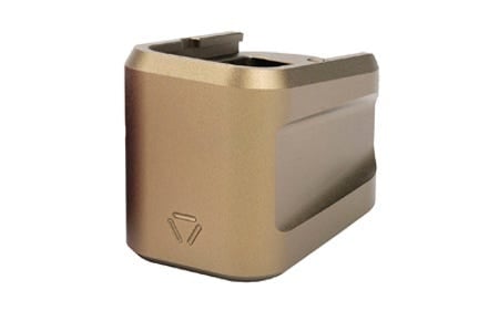 Strike Industries Aluminum Extended Magazine Plate (EMP) for GLOCK™ G19 (9mm) — FDE — slow drag / no snag aluminum design adds plus 5 rounds to OEM double stack G19 magazines; unified, aggressive aesthetic with included aluminum locking plate for extra security.