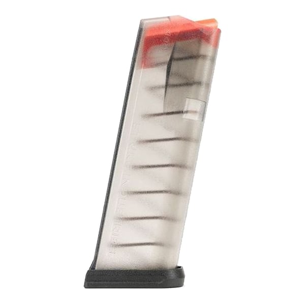 Strike Magazine for GLOCK® G19 (9mm) — Single — translucent, smoke 15-round magazine with tool-less baseplate for quick disassembly; orange follower and increased-strength spring for reliable, consistent performance; ambidextrous release cuts, drainage vents in the baseplate button, ergonomic edges, and ID markers for easy handling and labeling. Made from high-strength, impact-resistant custom blended SI Polymer Extreme.