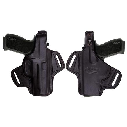 Reinforced thumb break for positive snap release. Rides at a forward angle. Double-stitching for added durability. Open muzzle design. Two piece construction with front molding and backside body. Molded for a secure fit. Covered snap to prevent the gun from scratching. Leather lined to protect your guns finish. Fits belt up to 1