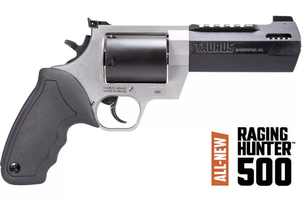 Winner of the 2019 American Hunter Handgun of the Year Golden Bullseye Award, the Taurus Raging Hunter is a next-generation, big-bore revolver that's first in innovation-and built to last. A fun and effective alternative for short- to medium-range hunting scenarios, this five-shot revolver is chambered in 500 S&W and is available in Matte Black or Two Tone finish. Its revolutionary angular barrel design cuts down on overall weight, while its factory tuned porting and gas expansion chamber reduces muzzle lift for quicker target acquisition. Cushioned insert grips ensure a comfortable, controllable shooting experience.