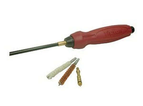 Carbon fiber is well-suited to the tough tasks assigned to cleaning rods. It combines the best features of stainless steel and coated cleaning rods, then adds valuable properties of its own. Stainless steel rods can scratch or wear barrels if they're used carelessly – though they won't pick up potentially damaging small abrasive particles. “Coated” rods get part of the job done – they keep the stainless steel shaft from damaging your barrel's rifling, but the coating will pick up small abrasive particles, which means you're effectively running finegrit sandpaper through your bore. Carbon fiber rods are the best of both: the carbon fiber can't scratch your bore like stainless steel, and they won't embed like coated rods. Plus, Carbon Fiber rods can be bent to an extreme degree and return to their original straightness. During Operation Iraqi Freedom, US military armorers called on Tipton to provide cleaning rods that would clean service rifles in demanding conditions. It made sense to them: Carbon fiber is an ideal material for cleaning rods. Tipton calls these cleaning rods “deluxe” because they feature an ergonomically designed handle that spins on two sets of ball bearings – the result is a cleaning rod that smoothly follows the rifling both pushing and pulling, even while under pressure. The “shank-through” construction also allows the user to apply “reasonable” hammer blows to the end of the cleaning rod to get a tight patch through a bore. Rifle and handgun rods are threaded for 8-32 accessories, except 17 caliber and 20 caliber rods which are threaded 5-40. Shotgun rods are threaded 5/16"-27.