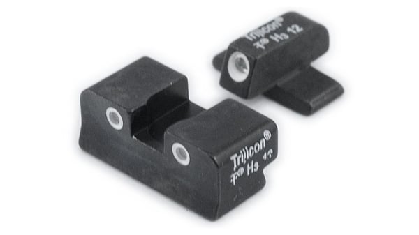 Green lamps are warranted for 12 years from the date of manufacture. Trijicon offers a choice of illuminated dot colors, to suit individual shooter preferences. Trijicon Night Sights are available with green, yellow, and orange aiming dots. The front sight is only available with a standard illuminated green dot. Trijicon recommends green dots because they are the brightest lamps. They are best for targets in low and no-light shooting conditions. However, because some shooters prefer greater distinction between their front and rear sights, Trijicon also offers yellow and orange dots for rear sights. Trijicon recommends yellow over orange for the rear dots because yellow is brighter, lasts longer, and therefore carries a longer warranty. Trijicon 3 Dot Bight Sight Sets are designed and assembled with the optimum combination of strength and safety. The atented aluminum cylinder and sapphire lens construction cannot be equaled. The brightness obtained from the tritium content is focused through the sapphire lens to give the maximum possible illumination. Because the sight blades are machined from steel rather than cast, their strength is unsurpassed. Trijicon Night Sights are the brightest, best and safest.