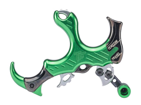 The new Tru-Fire Synapse thumb-button release with true double-sear operation features a broad range of adjustments that allow it to be perfectly customized to any archer's liking. Built on the platform of a weighted brass handle with an anodized aluminum cover, the Synpase allows users the choice of two finger extensions—a hook that wraps the ring finger for a 3-finger configuration as well as a fourth-finger extension. The internal stainless steel components are precision milled for exceptionally crisp operation and flawless cocking of the trigger activation lever. The thumb button is multi-position configurable, with lockable adjustments for trigger travel and trigger tension. The trigger pressure is adjustable from a range of 1.25 to 20 ounces without the need to change springs or disassemble the release.
