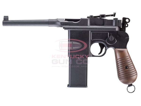 Legends C96 pistol Uses a 12-gram CO2 cartridge Semiauto Blowback* 19rd removable BB magazine Manual safety Fixed front sight Elevation-adjustable rear sight Single-action *The blowback on the C96 CO2 pistol functions the same as it does on the firearm. There is no slide. The only thing that moves is the bolt. The purpose of the bolt's movement is to cock the hammer (because this is a single-action pistol).