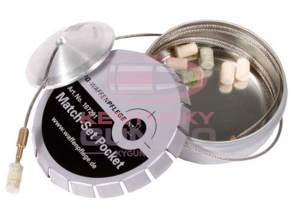 Pocket airgun cleaning system .177 caliber Includes metal case, plastic-covered flexible steel wire, handle (slotted disk), adapter and several cleaning attachments Handy cleaning kit travels with you without taking up much space. Tuck it into your pocket or slip it into your range bag. Great to have anytime you need to maintain your air gun.