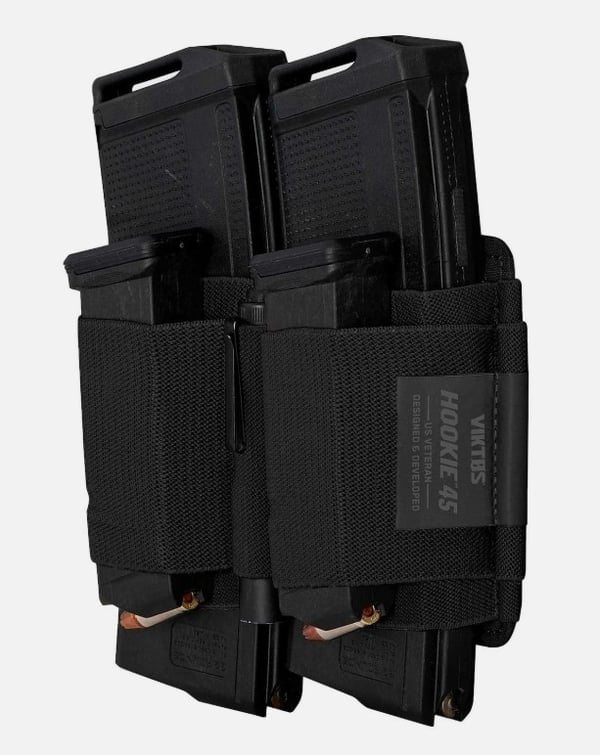 The Viktos Hookie 45 Mag Pouch is a modular magazine carrier designed to hold up to two rifle mags and two pistol mags using sturdy elastic webbing for secure retention. Its full hook backing mounts easily to any loop-faced panel—perfect for bags, safes, and modular loadouts. Designed by U.S. veterans and tested by professional CCW trainers, it offers reliable, organized mag storage and comes backed by a one-year workmanship and materials warranty.