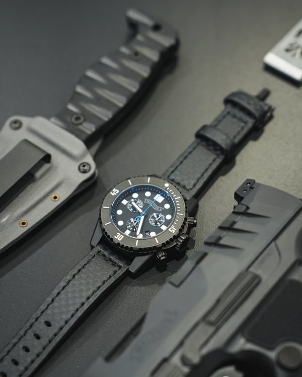 A rugged yet elegant timepiece built for precision and endurance. This chronograph is the perfect complement to the pistol, embodying strength and timeless design.