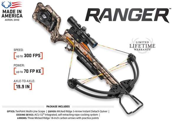Optics: TenPoint’s 3x Multi-Line Scope mounted on a machined aluminum 7/8-inch Fixed Dovetail Mount