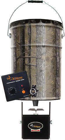 6.5 Gal. Photocell Hanging Steel Pail Feeder Kit, Includes: Camo Pail Hopper, Photocell Power Control Unit, Metal Spinner Plate, Powder Coated Metal Housing, Powder Coated Adjustable Mounting brackets, 30 ft./360 Degree Range, Weighs 11Lbs.