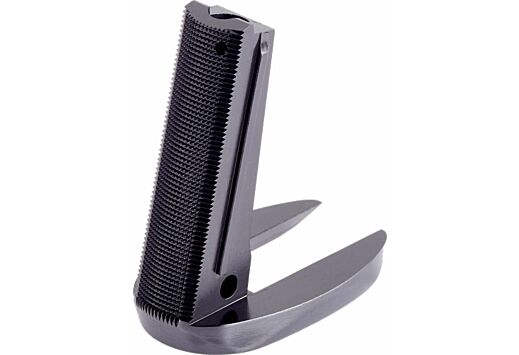 The One-Piece Bullet Proof Magwell is CNC Machined from a solid billet of hardened tool steel and can be seamlessly fitted to any standard 1911 frame with the largest magazine well opening possible. Available in a variety of popular grip options, this new part is the toughest magwell on the market with a large internal opening that ensures that you never miss a reload again. The low-profile, radiused contours are legal for competition and ideal for carry guns and perfectly machined 30 line checkering matches most fine custom handguns and will resist snagging your concealment garment.