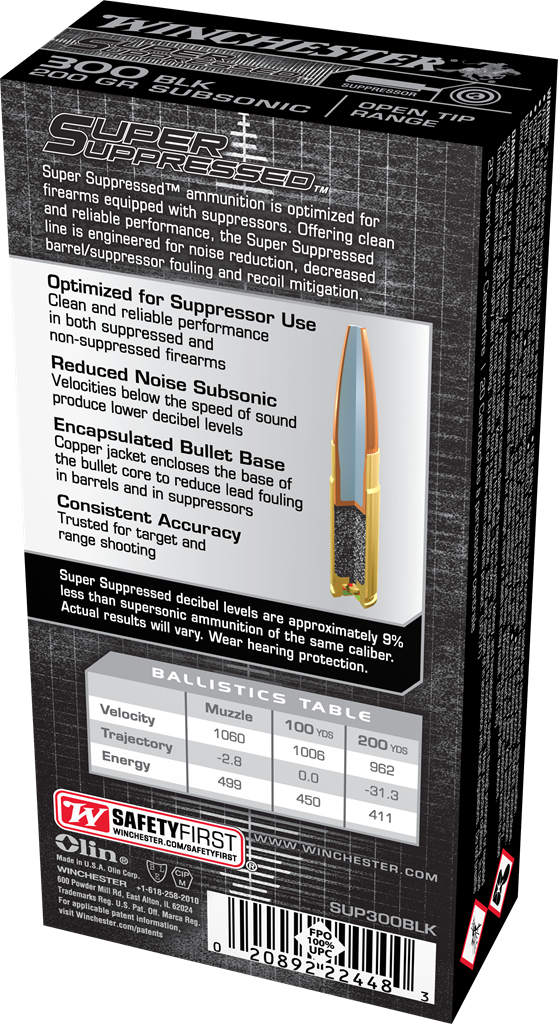 Super Suppressed ammunition is optimized for firearms equipped with suppressors. Offering clean and reliable performance, the Super Suppressed line is engineered for noise reduction, decreased barrel/suppressor fouling and recoil mitigation. Consistent performace and exceptional accuracy is backed by generations of Winchester legendary excellence.