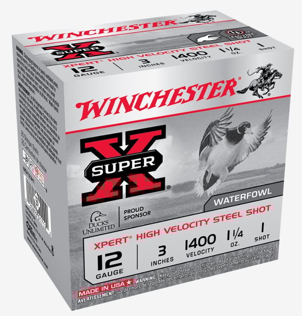 The Super X Xpert features a high-velocity steel shot that achieves a muzzle velocity of 1400 fps, ensuring effective range and knockdown power for hunting waterfowl. The 3-inch shell length and 1 1/4-ounce load provide optimal payload for dense and consistent patterns.