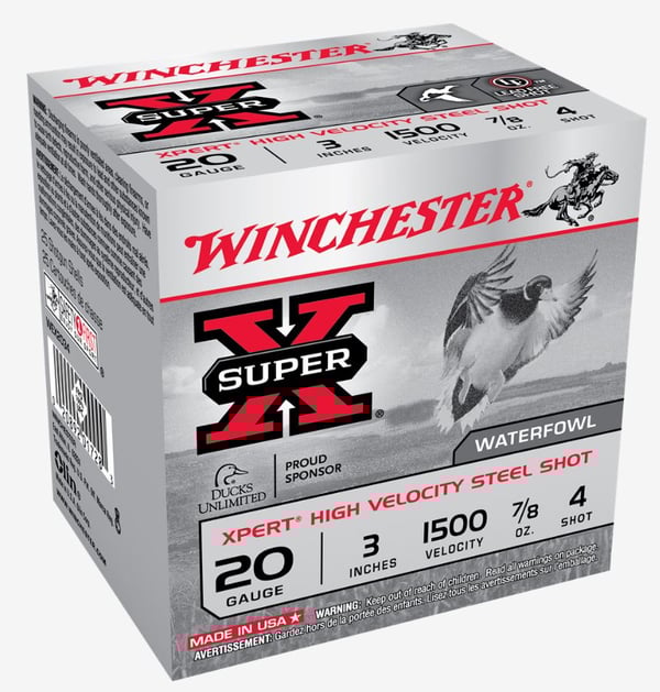 The Winchester Super-X Shotshell 20 Gauge 7/8 oz 3in Centerfire Shotgun Ammo, 25 Rounds, WEX2034 Gauge: 20, Number of Rounds: 25, Shotgun Shot Size: 4, Shotgun Shell Length: 3 in, Muzzle Velocity: 1500 ft/s, Ammunition Application: Waterfowl, Included Accessories: None, Shotgun Shot Weight: 7/8 oz, Shot Material: Steel, Primer Location: Centerfire, Cartridge Case Material: Brass, Lead Free Ammunition: Yes. is here at OpticsPlanet with fantastic deals Up to 28% Off! Please also check out more options for Winchester Super-X Shotshell 20 Gauge 7/8 oz 3" Shotgun Ammunition.