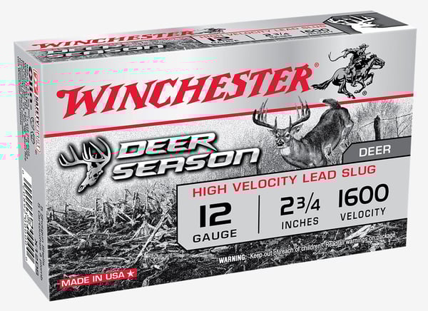 Winchester Deer Season Slug combines accuracy with massive impact performance to form the perfect ammunition choice for deer hunting. The slug has a unique stabilizing wad that provides a dome shaped tip. The slug and wad travel together down range giving you greater accuracy. On impact the slug and wad separate to deliver maximum energy on target with devastating terminal ballistics. The slug design is optimized for massive knockdown power on whitetail, mule and blacktail deer. Decades of Winchester experience pays off with a shotgun round specifically built for deer hunting.