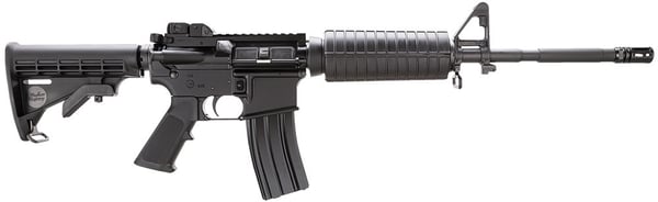 This MPC-RF semi-automatic has a gas impingement system with a manual safety lever and indicator markings on both sides of the receiver. The M4A4-type flat top upper receiver is made of forged 7075 T6 aircraft aluminum with an aluminum trigger guard and a hard coat black anodize finish. The 16" barrel is made of chrome-lined 4150 chrome moly vanadium steel with an M4 profile and A2 flash suppressor. It has a 6-position telescoping buttstock with M4 Double Heat Shield hand guards and a black plastic grip. It has an adjustable-height square post in a standard A2 front sight base, and this RF model MPC rifle features a removable Diamond head rear flip sight.